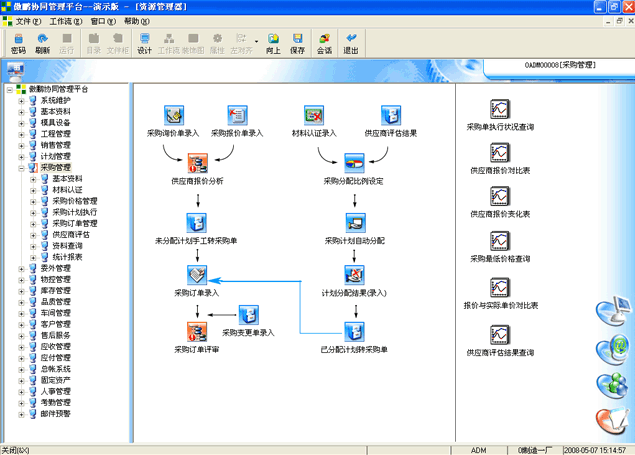 系统处理供应商管理、采购计划执行、采购计划分配供应商、供应商报价、供应商送货完成情况跟踪等业务。