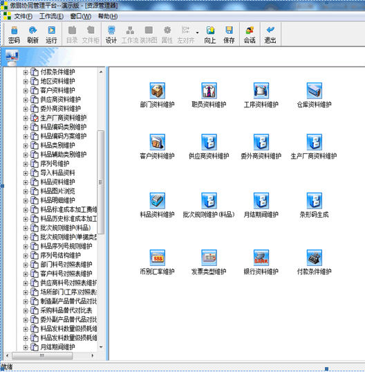 该模块主要功能是提供ERP运行所必需的基础静态数据的维护以及数据控制点的参数设置,包含了部门资料维护、员工资料维护、仓库资料维护、客户资料维护、供应商资料维护、料品资料维护、财务的相关资料维护等。