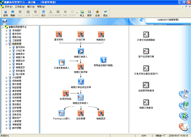 处理销售订单报价、销售订单审批作业,可根据需要灵活地设定相关审批流程,订单生产进度、出货完成进度监督。处理订单更改作业;出货通知单的执行,订单执行状况跟踪。