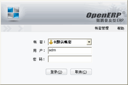 安装好后,电脑桌面上会有一个“傲鹏普及版ERP”快捷图标,双击此图标,打开OPENERP系统,登陆界面下图,帐套默认为“默认帐套”,用户默认为“ADM”,密码默认为“”(空,不用输入),直接点登陆即可