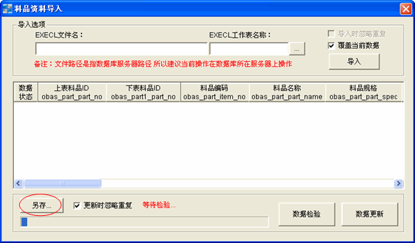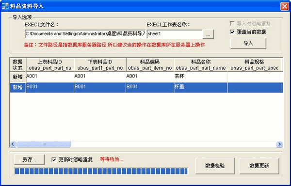 然后回到导入数据窗口,点“…”,选择刚刚保存的EXCEL档,然后再点“导入”按钮,系统自动把EXCEL中的数据自动更新到下面的空白窗口中,如果数据有误,会自动在数据状态栏显示错误信息,正常都是新增,如果显示重复,则表示此数据已经存在系统中了,不需要在重复导入了,如果显示错误,则哪个栏位那里显示*号这表示这栏的数据有问题;如果是新增状态,则直接点数据更新,自动更新进ERP系统中