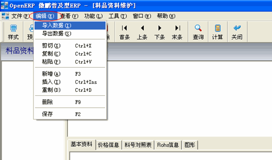 打开料品资料维护文件柜,点编辑菜单下的导入数据