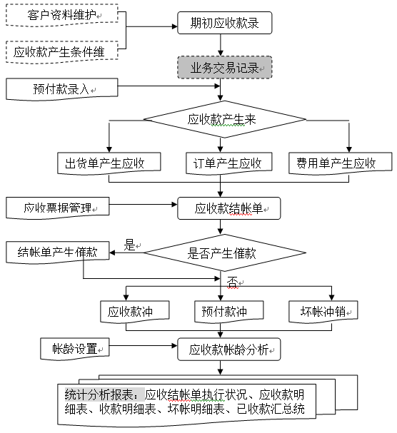 主要功能包括应收账款期初开帐,根据客户资料设定的发票类型、结算方式、收款方式、币别汇率等条件自动生成应收帐款,并可根据需要产生催款单、费用单,对特定无法处理的应收款还可生成坏帐单作为坏帐处理;系统支持预收款管理,并提供预收款手工冲销和自动冲销两种模式。系统提供大量跟踪分析统计报表,如应收账款执行状况、应收款明细表、收款明细表、坏帐明细表、已收款汇总统计、综合分析、帐龄分析等。